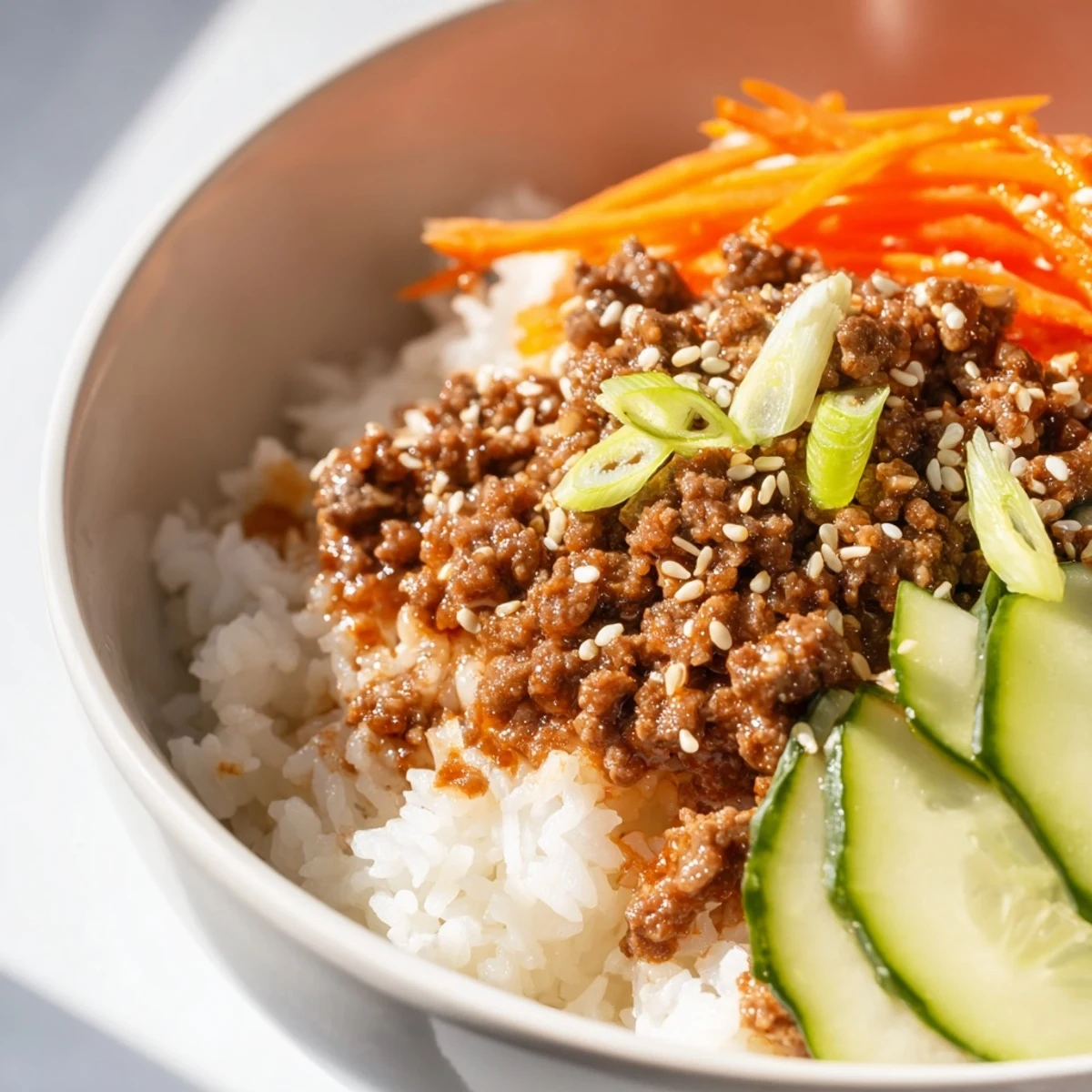 These Korean-inspired bowls feature savory ground beef coated in a sweet and spicy sauce, served over steaming jasmine rice with crisp julienned carrots, cool cucumber slices, and fresh scallions. The dish comes together in just 25 minutes, making it ideal for busy weeknights when you want something satisfying but don't want to spend hours in the kitchen.