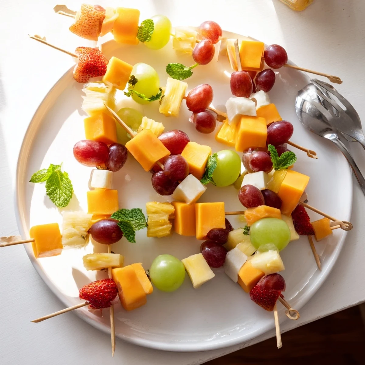 Cantaloupe, honeydew melon, kiwi, apple slices (tossed with lemon juice), and even grapes work beautifully. Firm fruits hold up best on skewers without becoming mushy.