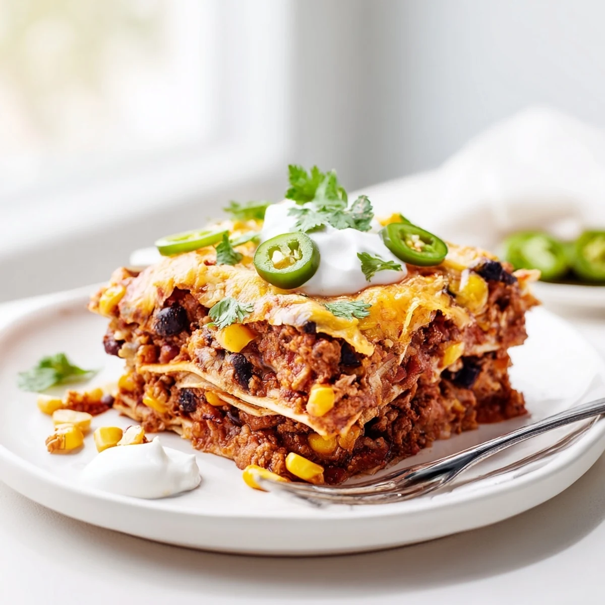 This Tex-Mex inspired dish stacks soft flour tortillas with a hearty filling of browned ground beef, black beans, sweet corn, and diced tomatoes. Seasoned with taco seasoning and aromatics like onion, garlic, and bell pepper, each layer gets sprinkled with a generous amount of shredded Mexican cheese blend. After 25 minutes covered and 10 minutes uncovered, the cheese melts into a golden, bubbling topping. Let it rest briefly before slicing into squares that hold their shape beautifully. Optional garnishes like fresh cilantro, sliced jalapeños, and sour cream add bright contrast. It's perfect for feeding a crowd and reheats wonderfully for leftovers the next day.