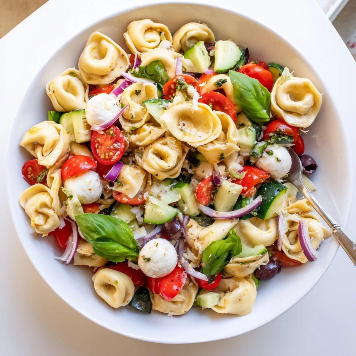 This vibrant tortellini salad combines tender cheese-filled pasta with crisp cherry tomatoes, cucumber, red bell pepper, red onion, and black olives. Fresh mozzarella balls and torn basil add creamy richness and aromatic brightness, all tied together with a zesty homemade Italian dressing featuring extra-virgin olive oil, red wine vinegar, and Dijon mustard. Ready in just 22 minutes, this versatile dish serves four and travels beautifully to picnics and potlucks.